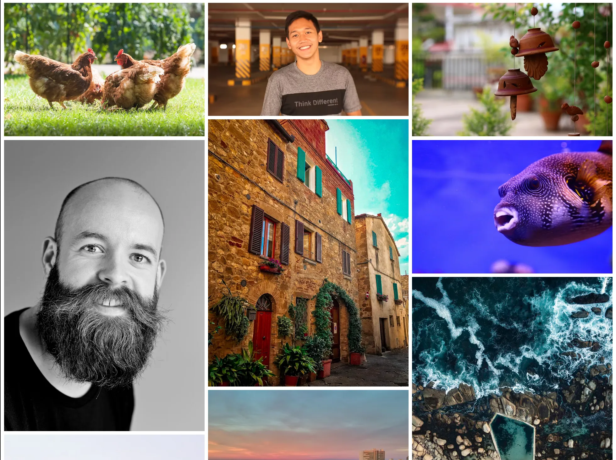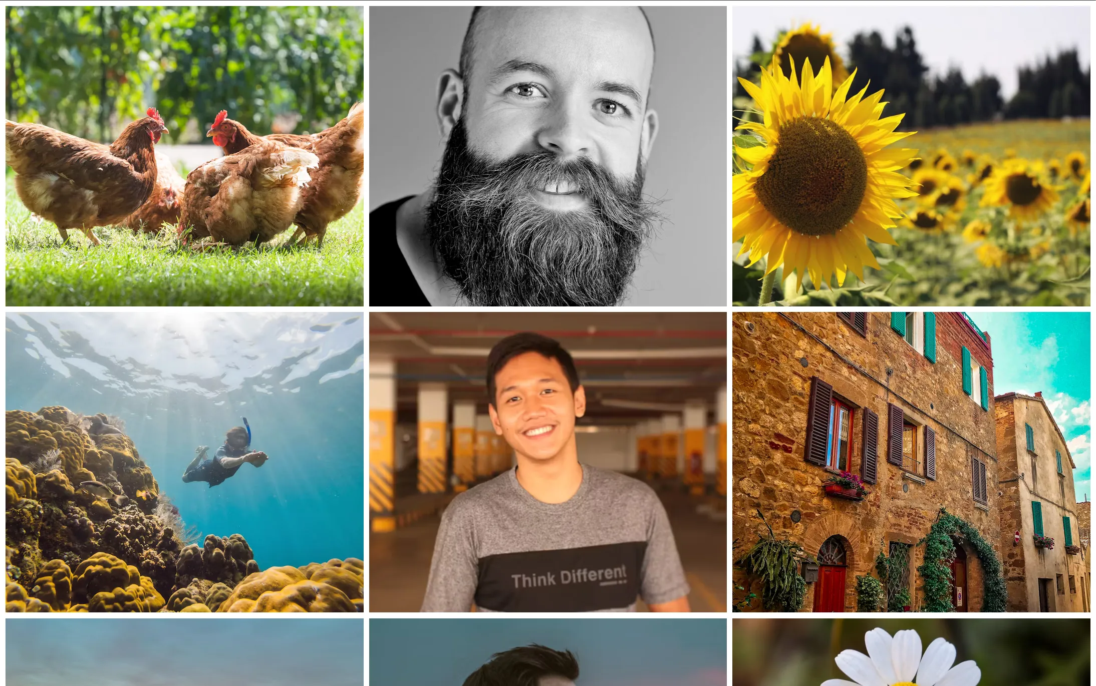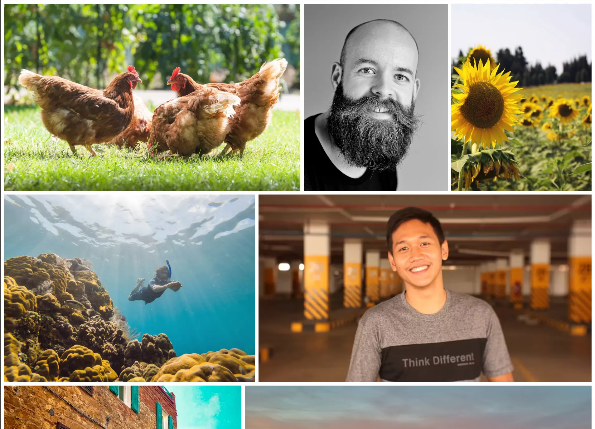 By setting object-fit: cover on img elements, the images expand to fill up their alotted grid space, creating a tiled image gallery with even spacing. Unfortunately, using object-fit: cover can lead to some awkward art direction, a side effect that’s unavoidable particularly when forcing both landscape and protrait images into a one-size-fits-all frame.